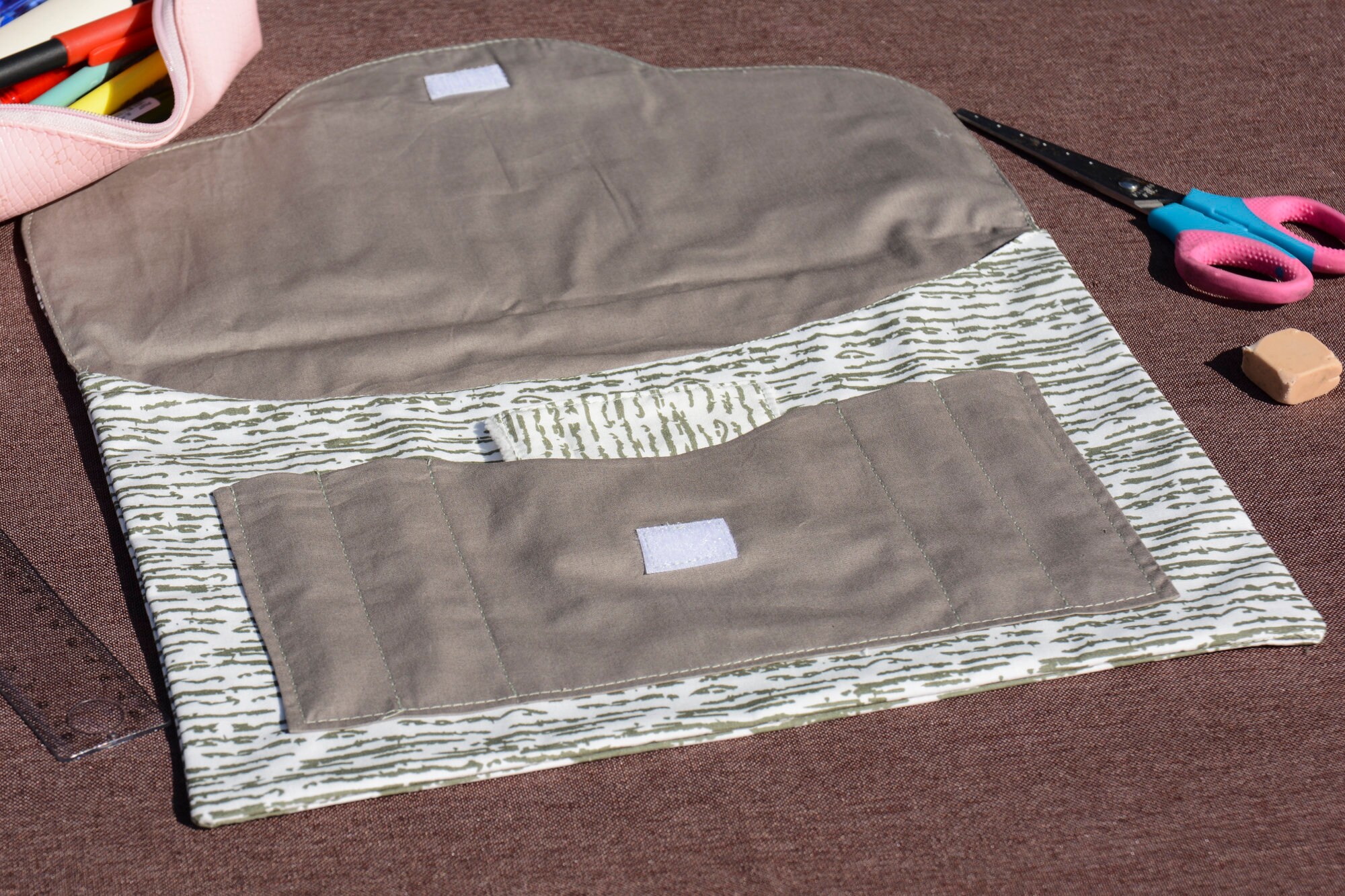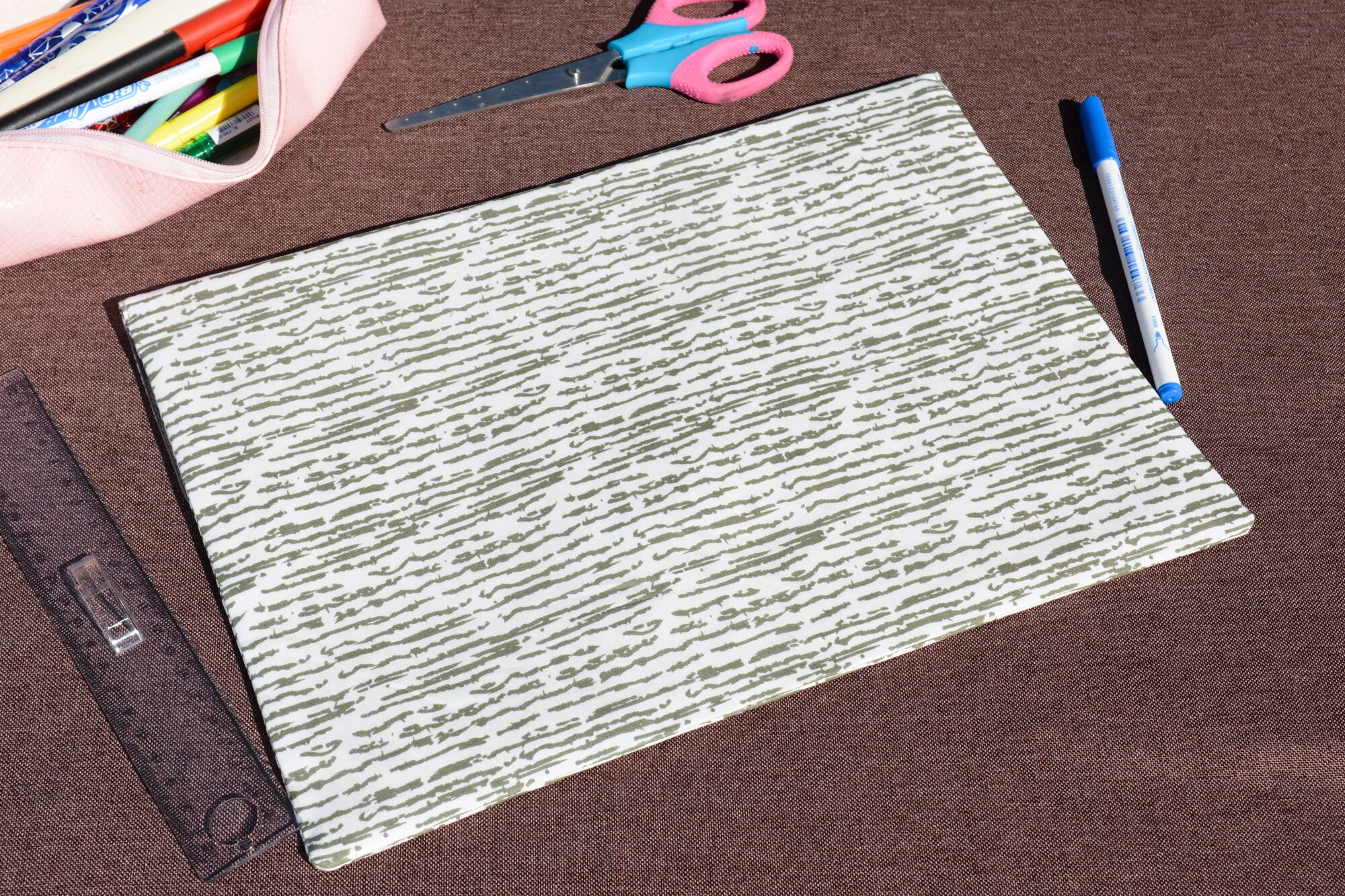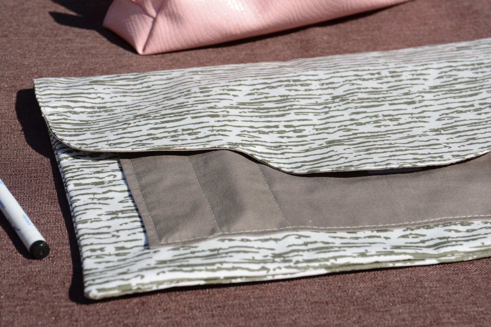 La pochette permet d’accueillir une ardoise (ou autre, non inclus) de dimension 33 cm x 23 cm, ainsi que 4 stylos (non inclus). Elle est également fournie avec une lingette en coton et éponge bambou. Elle se referme grâce à un scratch pour une utilisation facile.
