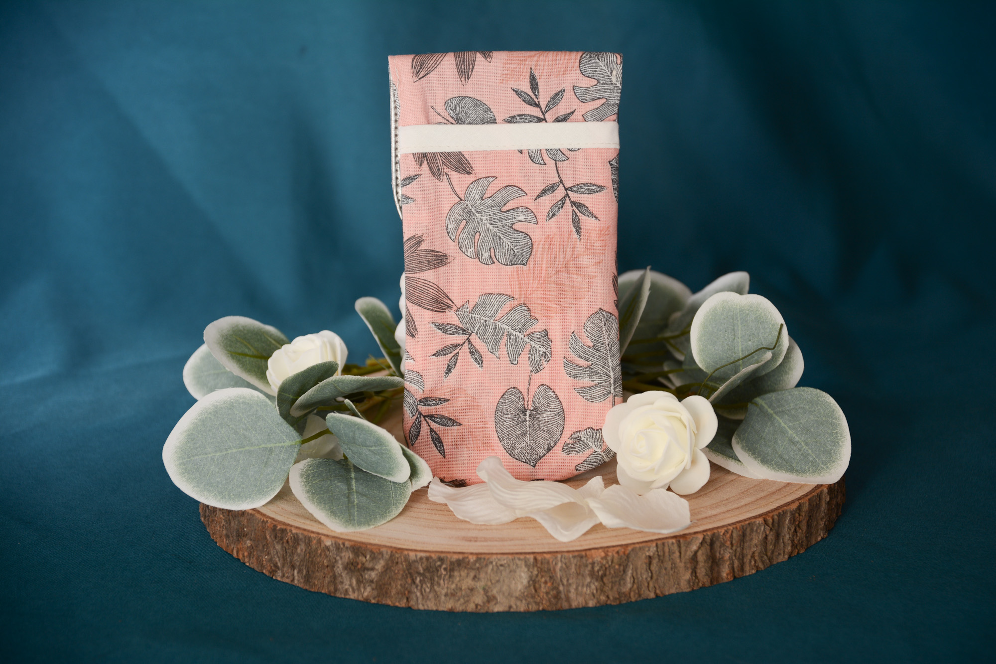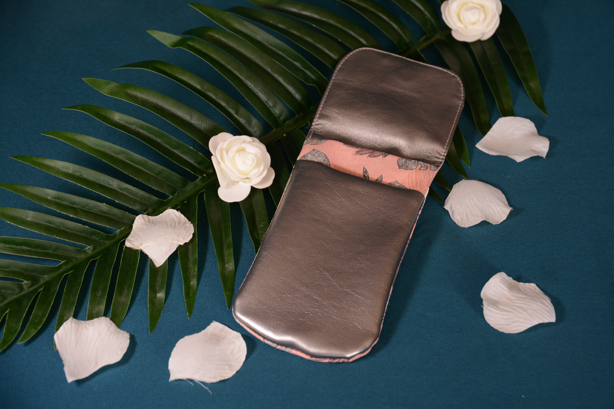 La pochette est composée de 2 types de tissus : un tissu en coton à motif (automne rose) et un simili cuir (argenté). Ces 2 matières étant lavables, vous pourrez facilement entretenir votre achat.