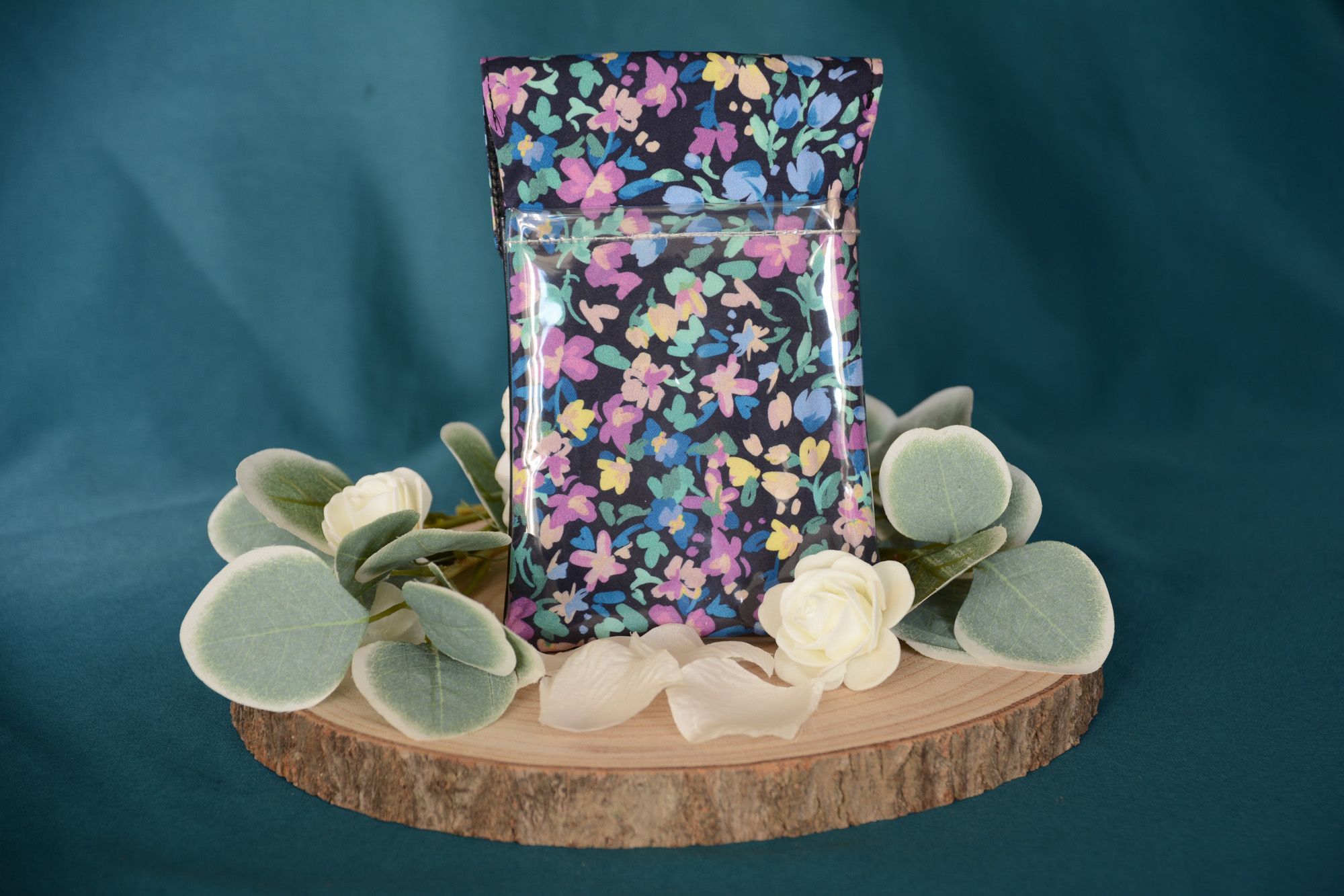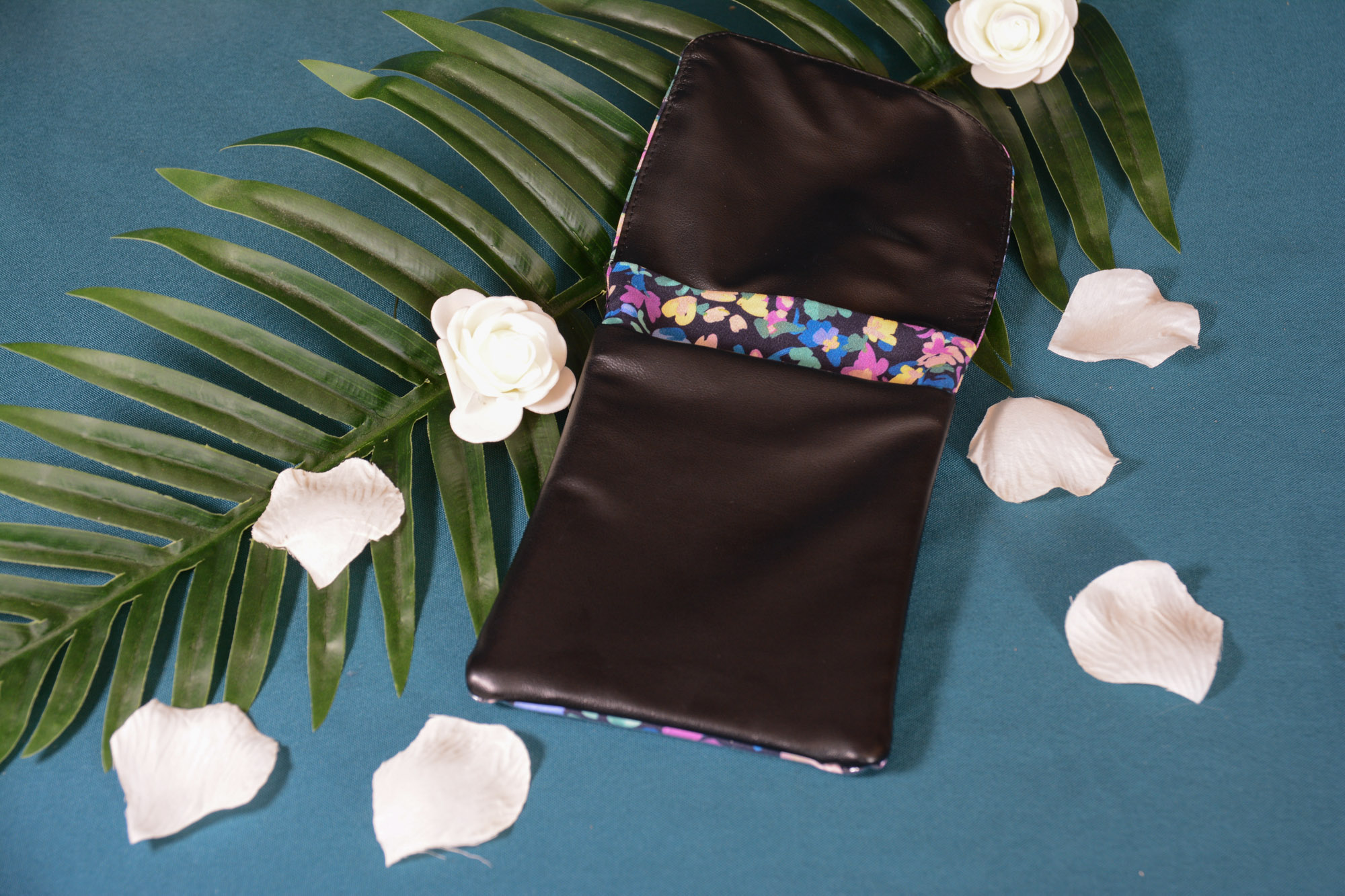 La pochette est composée de 2 types de tissus : un tissu en coton à motif (le fleur lila) et un simili cuir (le noir). Ces 2 matières étant lavables, vous pourrez facilement entretenir votre achat.