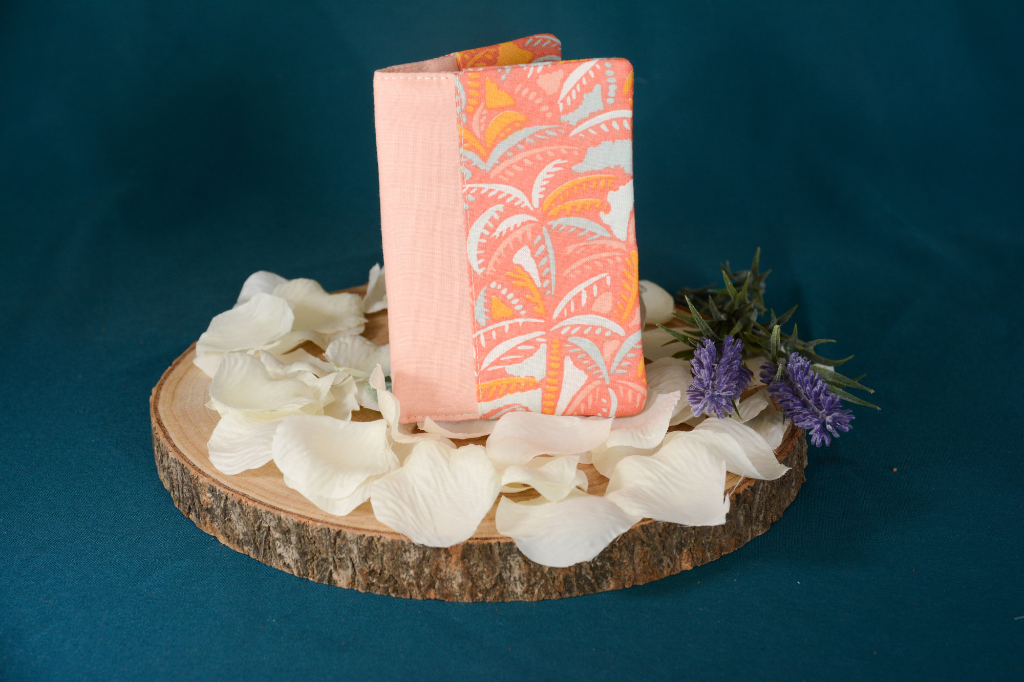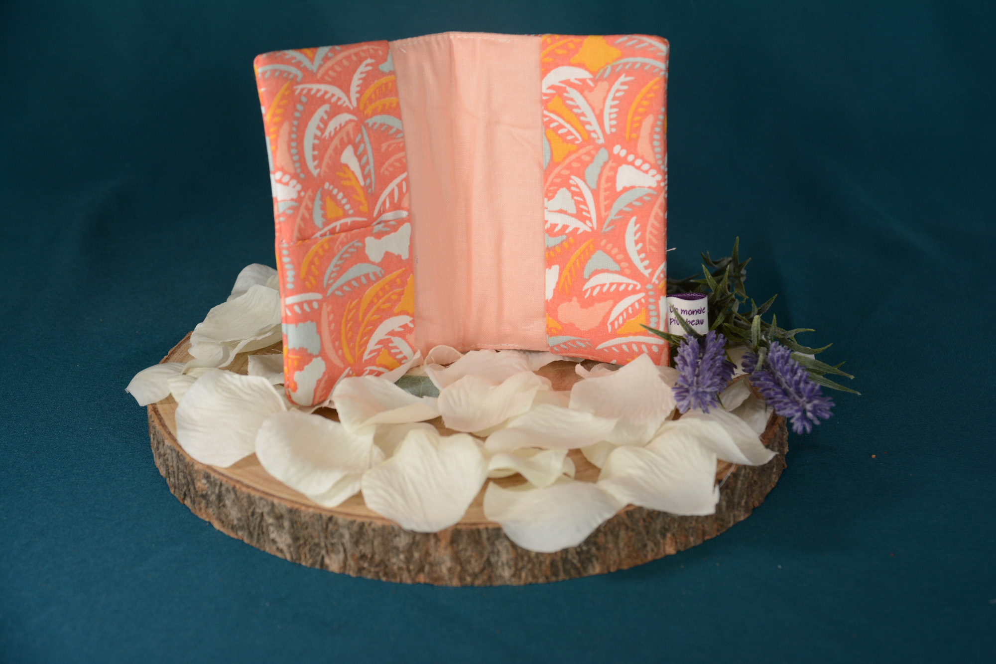 Protège passeport réalisé avec des tissus : Vacance et Corail. La personnalisation du produit est possible. Il s’agit d’un produit supplémentaire : l’option personnalisation. Ajoutez là à votre panier et ajoutez votre texte ainsi que la couleur de l’écriture.