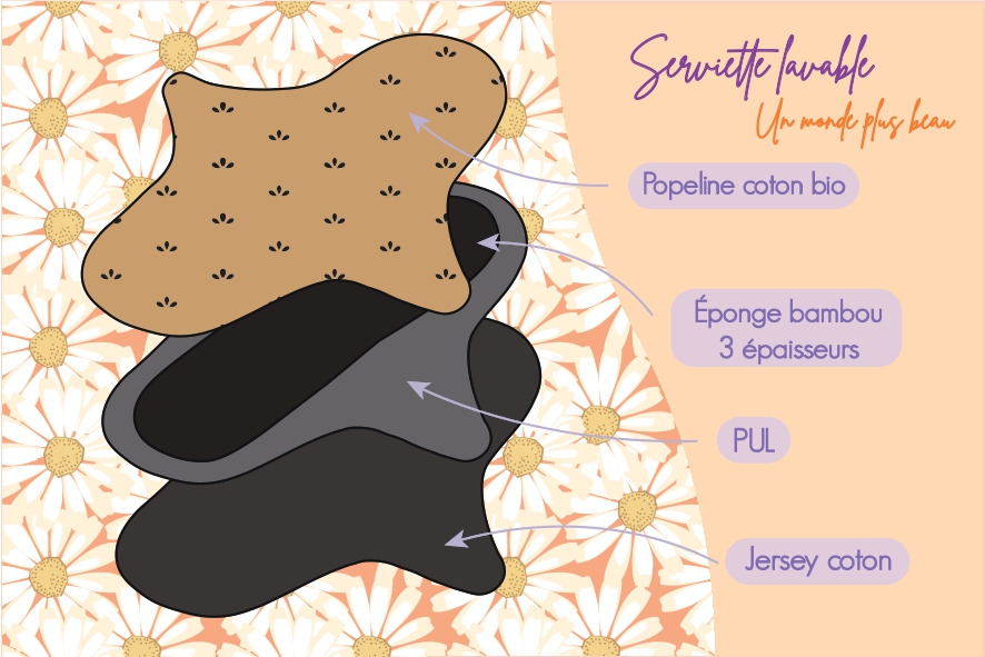 Chaque serviette lavable est composée de plusieurs couches pour faire la guerre aux fuites :